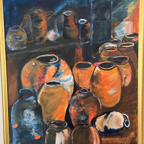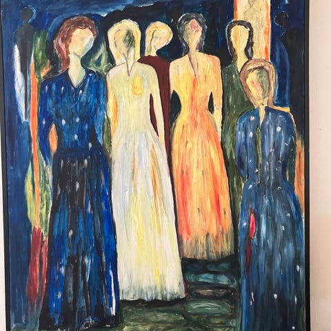 Maleri med figurativt motiv som viser flere stående personer i lange kjoler i ulike farger, blant annet blått, hvitt, grønt og oransje. Bakgrunnen er malt i mørke, kontrastfulle toner med innslag av grønt og rødt. Bildet er rektangulært og innrammet med enkel, mørk ramme. Signatur kan sees nederst på lerretet. Malt av Tove Merete Grønvold. Egner seg som veggdekor i stue, gang eller andre oppholdsrom. Maleriet måler76x96cm med ramme.