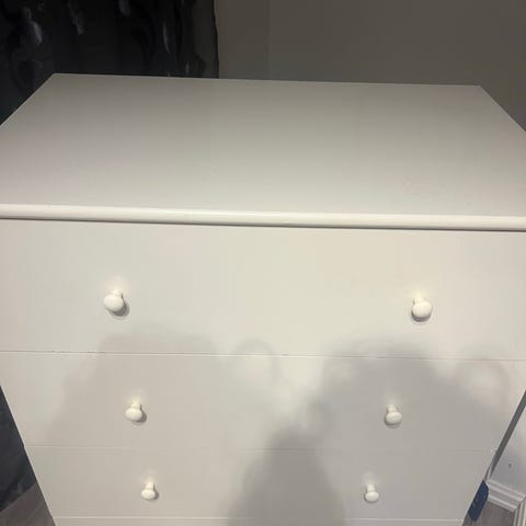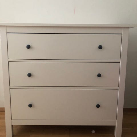 Selger kommoden til kr 200. Pent brukt. To små bruksmerker på toppen. Se bilde. Må hentes.
