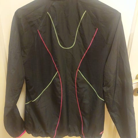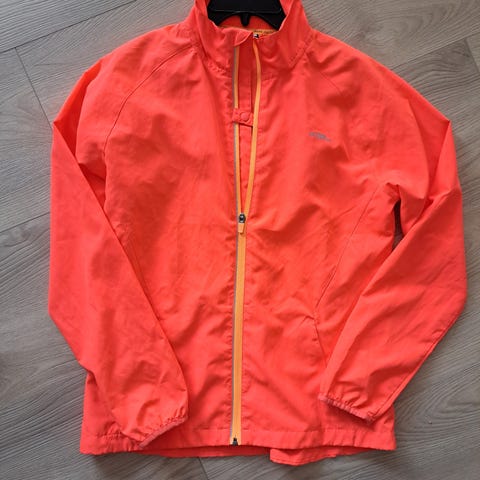 Burgunder jakke med oransje glidelåser fra Frank Shorter. Lett wind stopper. Str 40.