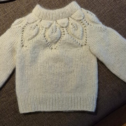 Nystrikket «Chunky Dahlia» barnegenser, strikket i str. 4 år. Den er muligens litt liten i størrelsen. Lengde (ekskl. hals) 38cm. Erm ca. 25cm. Strikket i garntype KOS.