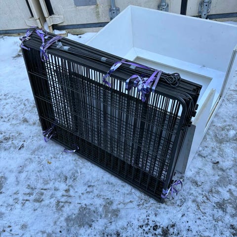 Valpekasse; Hvit kasse i tre med utsparing i front. Kassen har fire sider og bunn, med åpning i den ene langsiden for enkel tilgang.