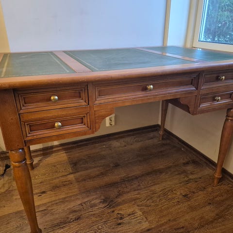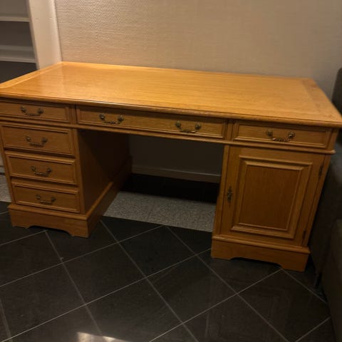 Eldre pent skrivebord i tre. Tror det er eik, men ikke sikker.. Best å de det.