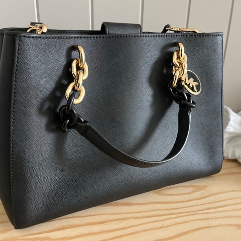 Michael Kors skinnveske for dame i svart lær. Vesken har doble skulderstropper og åpen hoveddel med glidelåslomme og flere innvendige lommer til organisering av innhold. Innvendig fôr med Michael Kors-logo og egen liten glidelåslomme samt åpne lommer som passer til mobil, nøkler og mindre eiendeler. Egnet som hverdagsveske eller jobbveske med god plass til personlige ting.