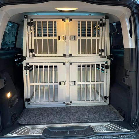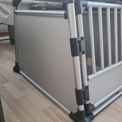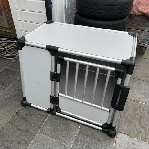 Bilbur i aluminium til hund. Buret har skrå bakside tilpasset bagasjerom i personbil og gitter i front og sider for lufting og oversikt. Dør i front med enkel låsemekanisme. Solid ramme i metall og tette plater i bunn og deler av sider for å beskytte bilens interiør. Egnet for transport og sikring av dyret i bilens bagasjerom. Størrelsen passer til mellomstore til større hunder/dyr, avhengig av rase og plass i bilen. Dybde 69cm, bredde 54cm og høyde 50cm.