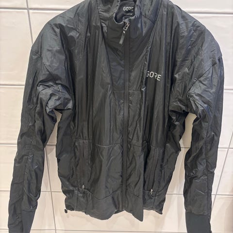 Gore Running Wear løpejakke i størrelse M, unisex. Jakken er svart og laget hovedsakelig av polyester med elastan for bevegelsesfrihet. Den har windstopper-materiale for ekstra vindbeskyttelse. Full glidelås i front og høy krage. Refleksdetaljer på ermene gir bedre synlighet i mørket. Egnet til løping og annen utendørs trening.