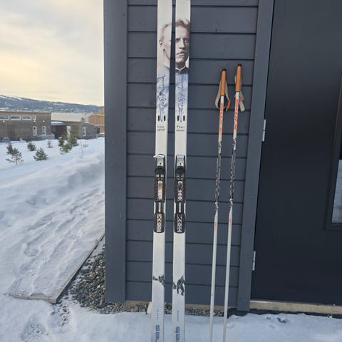 Åsnes fjellski med Rottefella-bindinger og Swix fjellski staver.