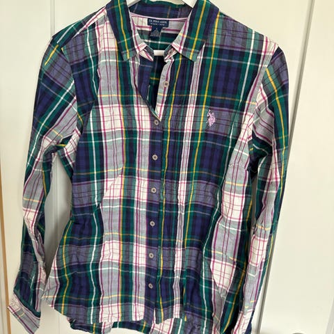 U.S. Polo Assn. poloskjorte for dame i størrelse M. Skjorten er hvit og laget av bomull. Modellen har kort erm, krage og knappestolpe med kontrastfarge og prikkemønster. Egner seg til hverdagsbruk og fritid, og kan brukes alene eller under genser eller jakke.