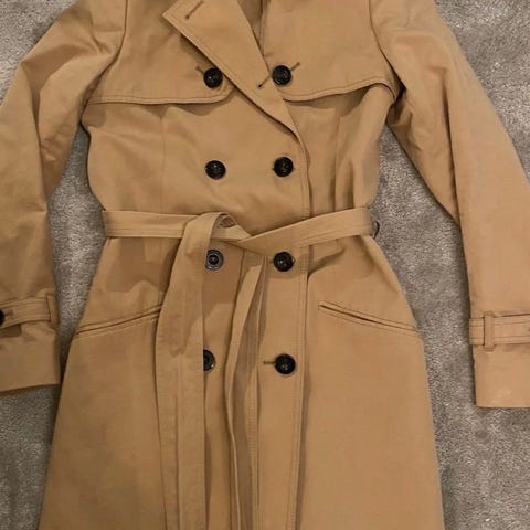 Tiger of Sweden trenchcoat for dame i størrelse 40. Kåpen er beige og laget i bomull. Modellen har klassisk dobbeltspent front, krage og beltehemper, samt sidelommer. Fôret innside. Egner seg som ytterjakke i overgangssesonger og milde dager.