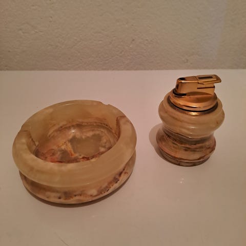 Bordlighter og askebeger i onyx og metall. Lighteren har rund steinsokkel med naturmønster i beige, brun og gyllen tone, og metalltopp i gyllent metall. Askebegeret er rundt med tilsvarende stein og metallkant samt spor for sigarett.