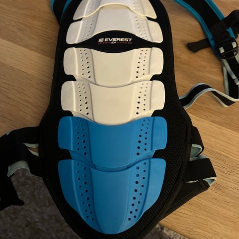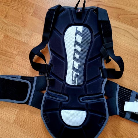 Scott ryggskinne i størrelse XL. Modellen har justerbare skulderstropper og bredt midjebelte med borrelås for god tilpasning. Yttersiden består av leddet, hard plastplate i grå farge med svart og gul kant, mens innsiden har polstrede felt for komfort mot ryggen. Passer til bruk ved ski, snowboard, sykling eller annen aktivitet der ryggbeskyttelse er ønsket. Størrelse XL er oppgitt til ca. 170–184 cm kroppshøyde.
