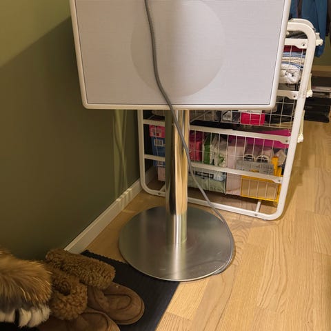 Anlegget er et alt-i-ett system med innebygd CD-spiller, radio og mulighet for tilkobling av eksterne lydkilder. Fronten har integrert høyttalerstoff og display som viser blant annet radiokanal og avspillingsinformasjon. Enheten står på rund fot i metall og har betjeningsknapper på toppen. Fjernkontroll følger med, som vist på bildene.