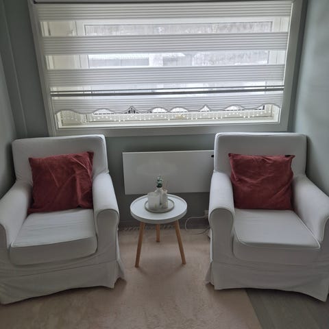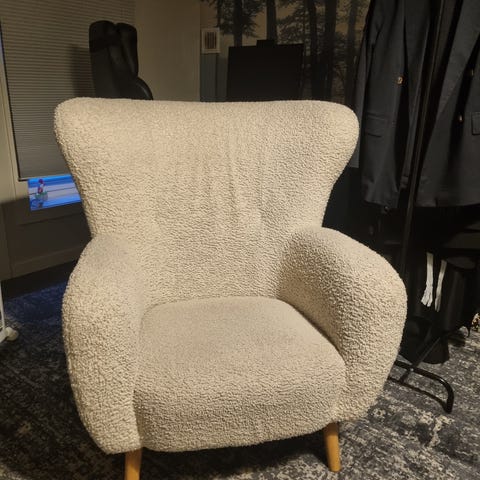 Stofftrekk. Sete- og ryggputer i skum. Ben i massivt tre. B91 x H98 x D88 cm