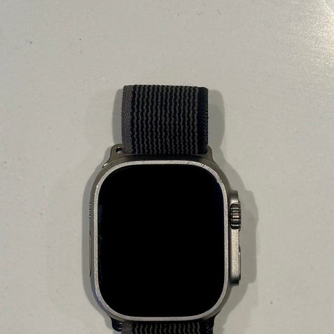 Apple Watch Ultra smartklokke med 49 mm urkasse i titan og safirglass. Modellen har GPS og Cellular (eSIM-støtte) for tilkobling uten telefon i nærheten. Klokken har keramisk bakside med optiske og elektriske sensorer for måling av puls og annen aktivitetsdata. Vannbestandighet er oppgitt til WR 100 m, og klokken er merket for dykking til 40 m (Dive 40 m). Leveres med svart sportsreim og lader som vist på bildene.
