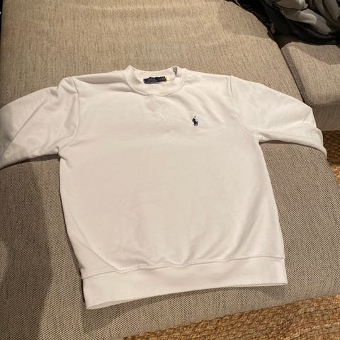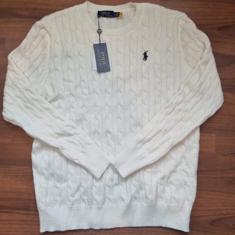 Ralph Lauren genser for herre i størrelse L. Genseren er beige og laget av bomull. Den har lang arm, høy hals med glidelås og ribbestrikkede kanter. Klassisk brodert logo på brystet. Passer til hverdagsbruk og kan kombineres med både bukse og jeans. Brukt en gang så er som ny!