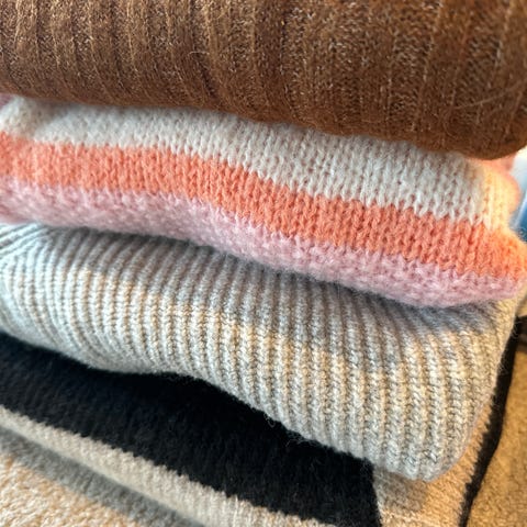 Materiale ifølge lapp: 19 % mohair, 17 % ull, 24 % nylon, 26 % polyester og 14 % metallisk fiber. Genseren har en myk og lett lodden overflate typisk for mohairblandinger.