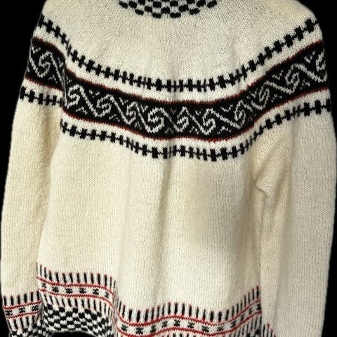 Vintage strikket genser i ull med et tradisjonelt mønster i hvitt og svart, med gult, grønt og rosa i hals og ved ermene. Den er hjemmelaget og fra ca år 1995, men er svært lite brukt. Passer small og medium.