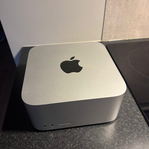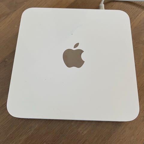 Apple Time Capsule A1409 router med integrert harddisk på 2 TB. Enheten fungerer som trådløs router og nettverkslagring. Den har flere Ethernet-porter på baksiden for kablet tilkobling av nettverksutstyr, samt strømtilkobling.