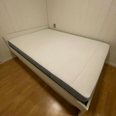 Senga er lite brukt siden vi bare har brukt den som gjesteseng. Senga har alltid vært brukt med overmadrass (ikke inkludert).