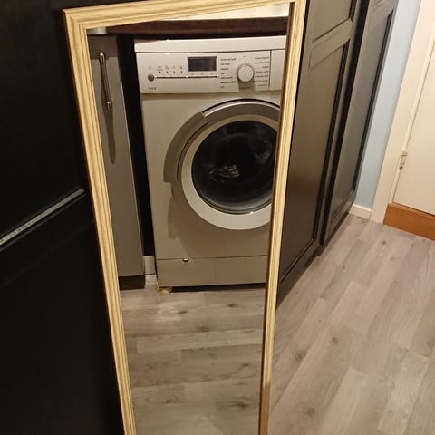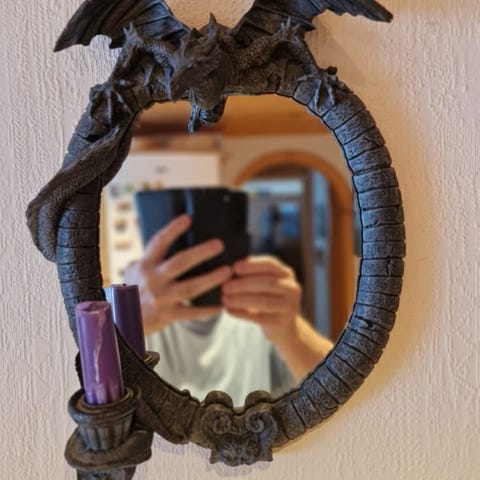Speil med drager rundt. Den ene dragen mangler en glasskule, men det er ikke noe man legger merke til. Kjøpt i 2023.