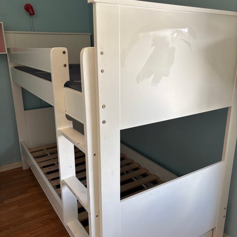 Loftseng fra Jysk i hvit utførelse. Modell Vestervig. Fint å ha f.eks. barneseng, pult eller lekerom under loftseng.