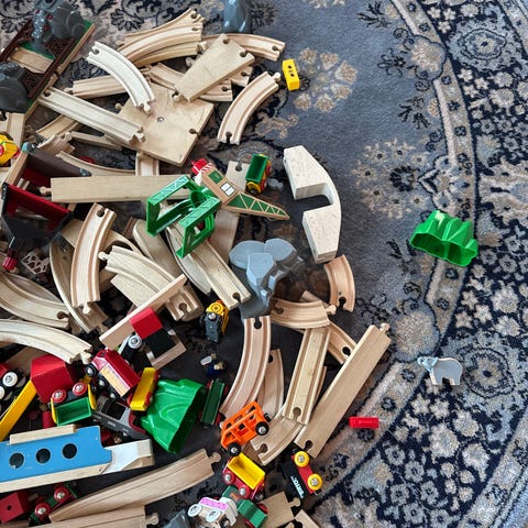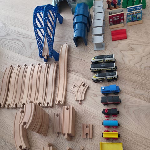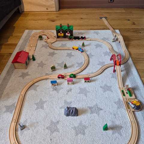 Togbanesettet består av Brio, samt noen skinner fra andre togbaner av annet merke som passer overens. Ekstra tog og tilbehøret på bildet følger med.