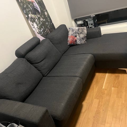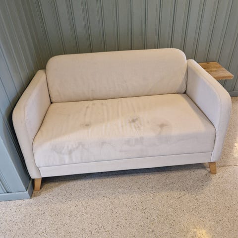 Sofa gis bort, litt skeiv pga ene beinet men antar dette er noe som kan fikses.