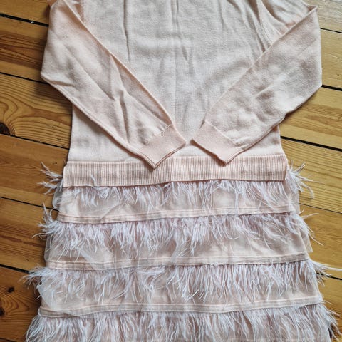 Kjole fra Mayoral, str 8 år. Blå og hvitstripete med liten hvit sløyfe foran. Blondedekor på skuldre og bak.