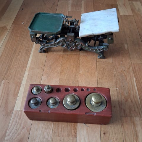 Sjarmerende gammel kjøkkenvekt i metall med original skål. Nydelig grønn farge og klassisk design. Perfekt som pynt på kjøkkenet, i hytte eller til landlig interiør. Egner seg til veiing av mindre mengder matvarer eller andre små gjenstander på kjøkkenet eller i husholdningen.