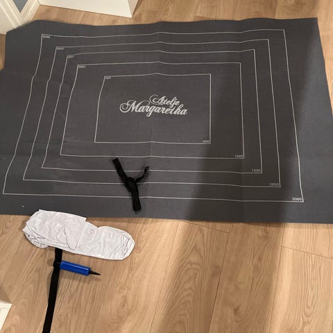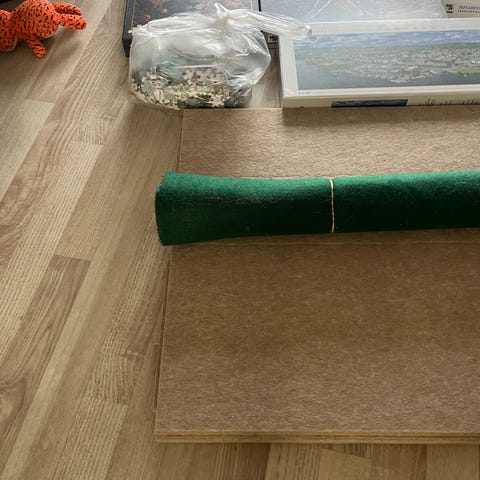 Puslespillmatte i grønn tekstil med trykte rektangler som markerer anbefalt arbeidsområde for puslespill med 500, 1000, 1500 og 2000 brikker. Matten leveres med et rør som kan brukes til å rulle sammen puslespillet for oppbevaring eller flytting. Egnet som underlag ved bygging av puslespill på bord eller gulv, og bidrar til å holde brikkene samlet og beskyttet når puslespillet ikke er i bruk.