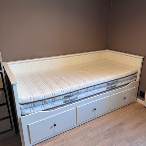 Brimnes dagseng med to skuffer selges. Sengen kan enkelt dras ut og bli en dobbeltseng. Like enkelt tas sammen til en enkeltseng. Kan også fint brukes som en sofa om man ønsker det. Sengen har bruksmerker, se bilder. Det ble gjort en feil ved montering, slik at det er to hull på hver ende av sengen i treverket.