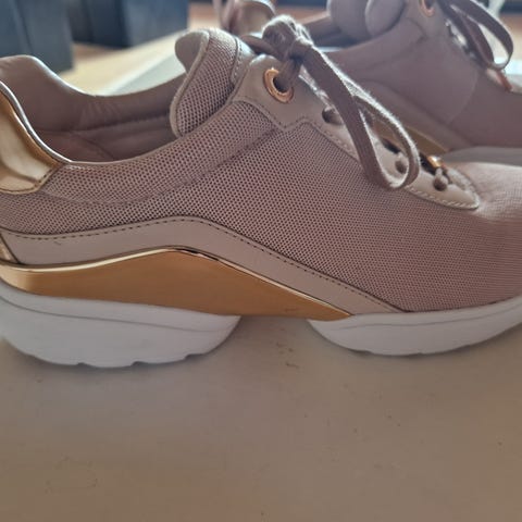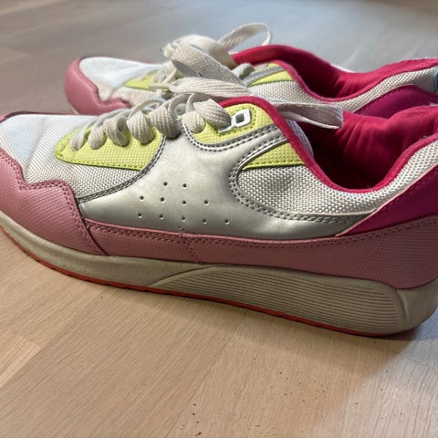 Joggesko / sneakers i størrelse 40. Skoene er i lys rosa farge med flerfarget mønsterdetalj på overdel. Modellen har snøring foran, flat såle og lavt skaft. Passer til hverdagsbruk og fritidsaktiviteter.