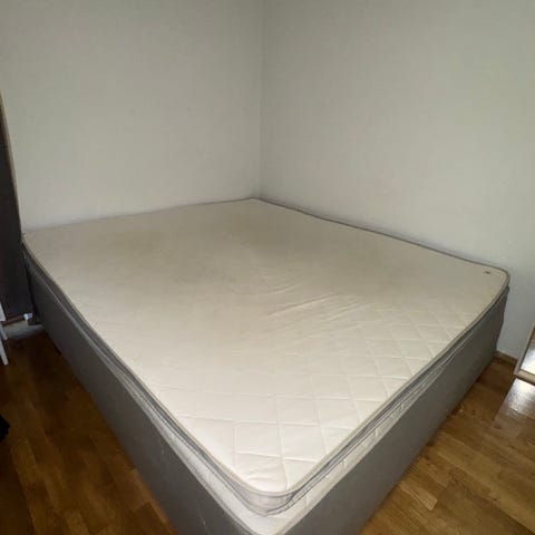 En godt brukt seng men i god stand. 180x200, 40 (20cm kvar del). Har sengeramme og madrass. Har ikke ben på, kan sikkert fikses selv. Kjøper må hente snarest mulig.
