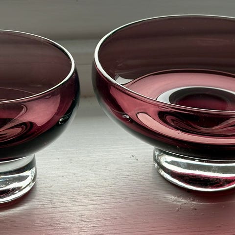 To glassboller av typen "April" fra Hadeland Glassverk, designet av Willy Johansson på 1960- eller 1970-tallet. Munnbåst kunstglass på stett.
