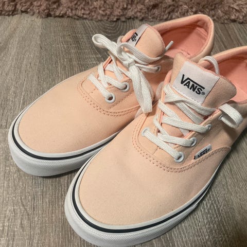 Vans i størrelse 40. Modellen har overdel i tekstil i lysegul farge med hvite lisser og hvit sålekant. Klassisk Vans-yttersåle i gummi med vaffelmønster.