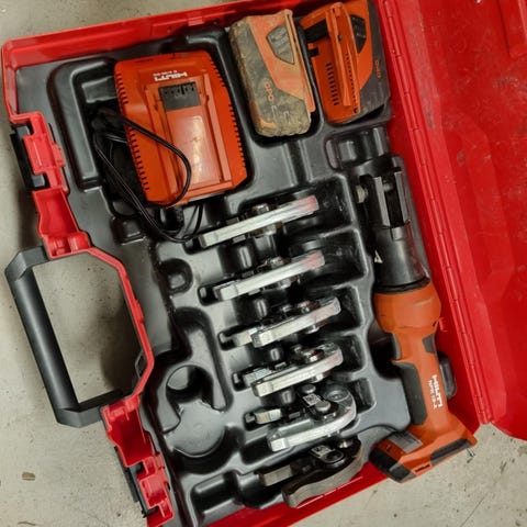 Batteridrevet hydraulisk kabelpresse for pressing av kabelsko og kabelhylser. Settet inneholder selve presseverktøyet, flere utskiftbare pressebakker i ulike størrelser, batteri, lader og bære-/håndreim. Leveres i eske, som på bildet.
