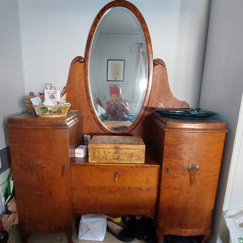 Den andre er en speilkonsoll med marmor og utsmykning. Jeg vet ikke hvor gammelt speilet er, eller om det kan være tin/kvikksølvamalgam. Jeg vil derfor helst gi det til en forhandler/noen som kan håndtere antikke speil på en trygg måte.