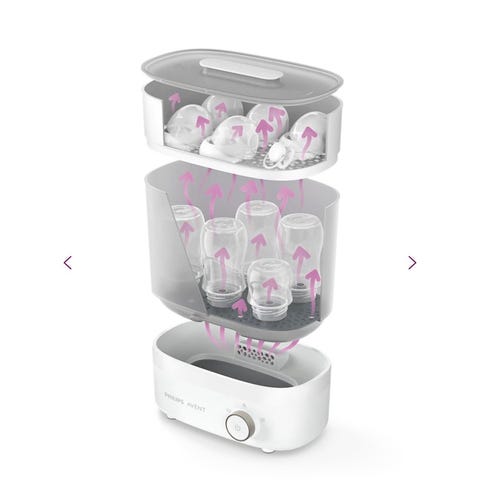 Philips Avent Sterilisator for tåteflasker, steriliserer raskt og enkelt opptil 6 flasker samtidig. En sterilisering tar 10 minutter og krever ingen kjemikalier. Den kan brukes for å sterilisere mindre gjenstander, som smokker og lignende. Steriliseringen fjerner opptil 99,9% av alle bakterier.