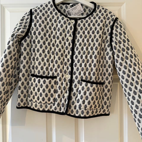 Vila jakke for dame i størrelse 40. Jakken er flerfarget med svart og lys rutete mønster. Materialet er akryl. Modellen har lange ermer, rund hals og knappelukking foran. Passer over topp eller kjole i hverdagen eller til enklere penere anledninger. Tag er klippet av, men er ikke brukt da den ble for stor