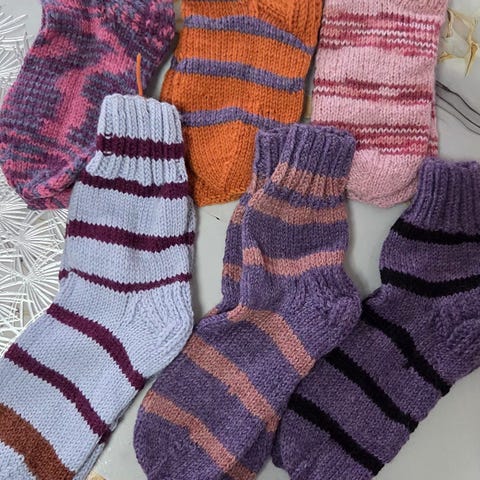 Håndstrikkede sokker i flerfarget mønster. Sokkene har hovedfarge i rødt med detaljer i hvitt, grønt og gult, inkludert hjerte- og stjernemønster. Strikket i tykt garn som egner seg til bruk inne som varmesokker eller som vintersokker. Passer til voksne, avhengig av fotlengde og omkrets. Egnet til hverdagsbruk eller som julesokker.