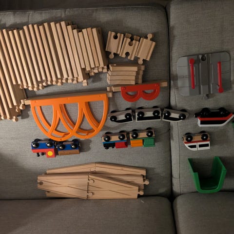 BRIO togbane i tre med ulike rette og buede skinner, tog og tilbehør. Sett med flere togvogner i plast og tre, samt ulike elementer som tunnel, bygninger og andre deler til jernbanemiljø.