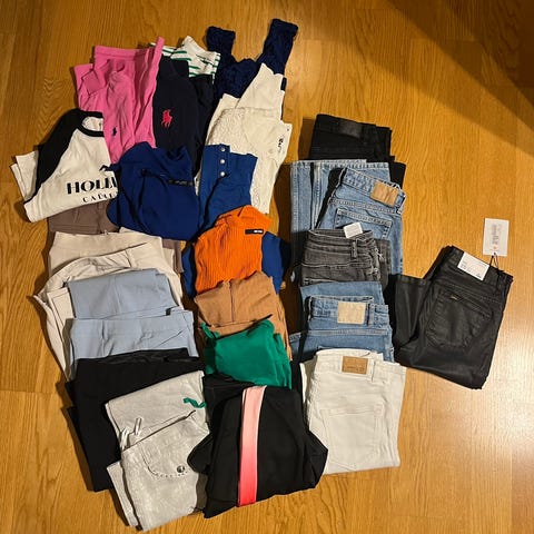 Stor klespakke med underdeler. Klespakken består av 3 dongeribukser, 3 finere bukser/dressbukser, 2 shorts, 4 kosebukser, 1 treningsbukse og 1 turbukse.