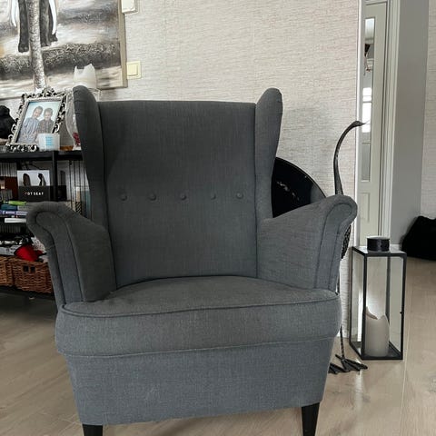 Pent brukt IKEA Strandmoen stol + puff. Mørk grønn farge. Stolen og puffen er pent brukt, og har få bruksmerker.