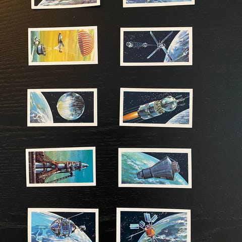 Samlekort fra Danish Dandy Gum, fra 1969 . ( I serien "Kampen for universet") Lotten består av tre svart-hvitt portrettkort av kosmonauter/teknikere, med trykt informasjonstekst på baksiden på dansk og engelsk. Kortene er produsert i Danmark for Dandy, Vejle: