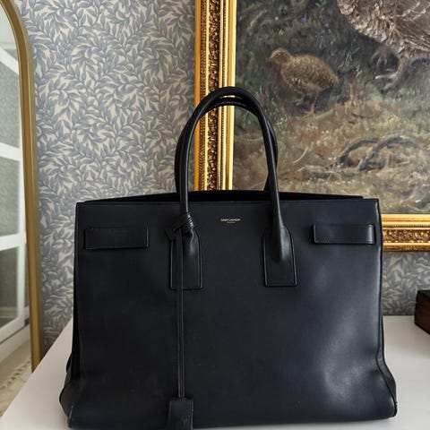 Selger min YSL tote bag i strukturert skinn med romslig hovedrom, diskret Saint Laurent-logo og rene, tidløse linjer. Praktisk og elegant design som passer både hverdag og jobb. Vesken er autentisk og følger med dustbag og autentisertskort.