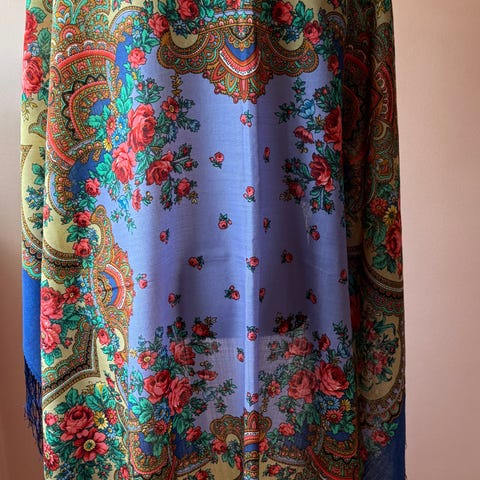 Russisk rosesjal str 90x90 cm pluss 8 cm frynser. Tynn,fin ull, nydelige dempede farger.