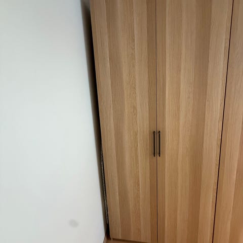 Jeg har skrudd inn noen kroker på siden av skapet for ekstra oppheng av jakker. Dette kan enkelt skrus ut, men har etterlatt noen hull på innsiden. Dette er for øvrig ikke spesielt synlig.