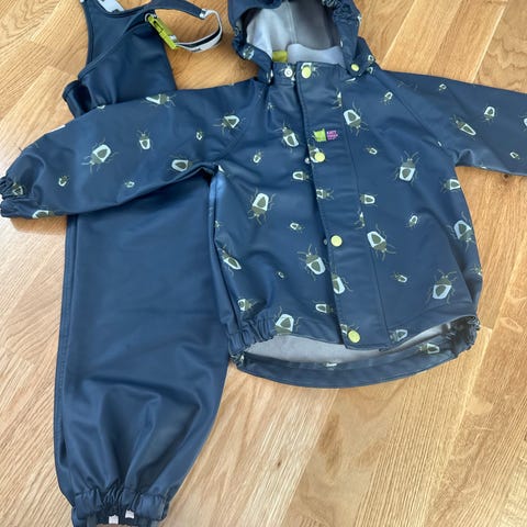 AI: Kattnakken regnsett for barn i størrelse 104. Sett i rød polyester, unisex, bestående av regnjakke med hette, selebukse og sydvest. Jakken har glidelås foran og elastikk ved ermer. Buksen har justerbare seler, strikk under foten og elastikk nederst i bena. Stoffet har mønster med stjerner og andre figurer. Egnet som yttertøy i vått vær for barn rundt størrelse 104.