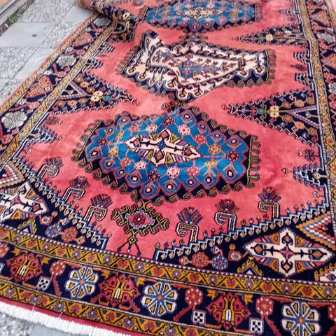 Vakkert persisk teppe i ull. Fine farger i mørk rød, grålilla, beige, sort, blå. I god stand. Noen små ubetydelige flekker.