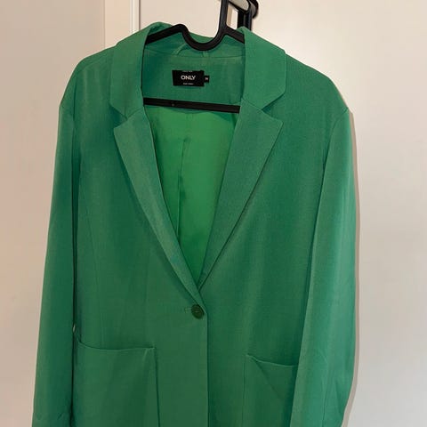 Flott ONLY blazer for dame i størrelse 36. Fin grønn farge. Sitter pent på. Modellen har krage, åpen front uten synlig lukking og to frontlommer med klaff. Ermene er trekvartlange med rynkedetaljer. Passer til både hverdagsbruk og mer formelle anledninger, og kan kombineres med bukser, skjørt eller kjole.