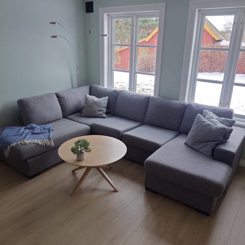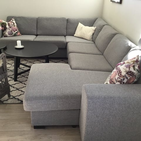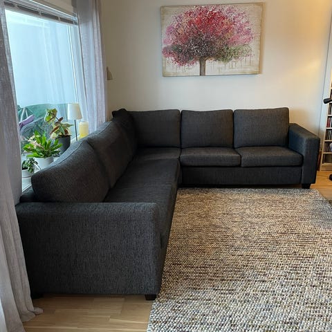 Sofaen er 265cm x 225cm. Se bildet. Kjøpt hos Skeidar.